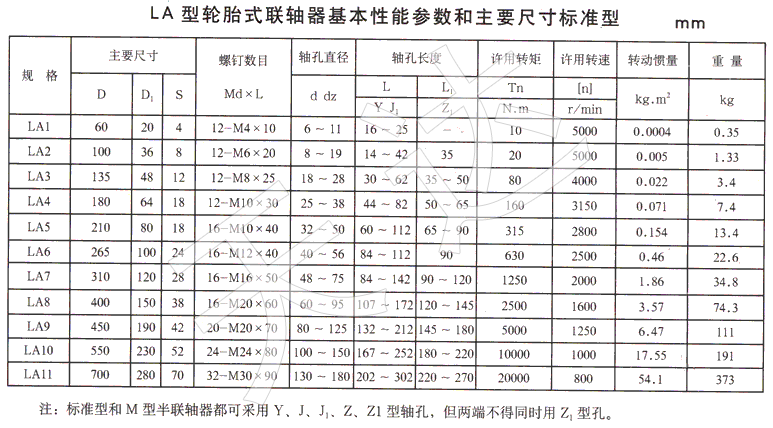 LLA型冶金设备用轮胎式联轴器基本性能参数和主要尺寸