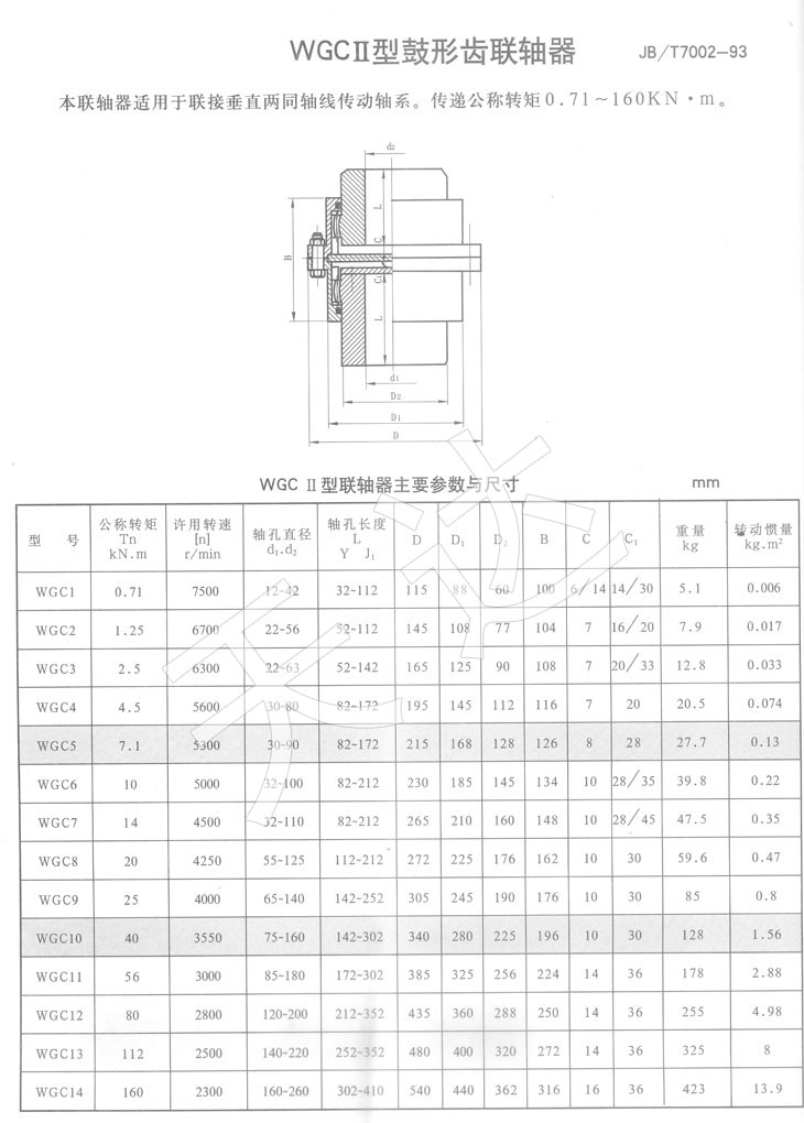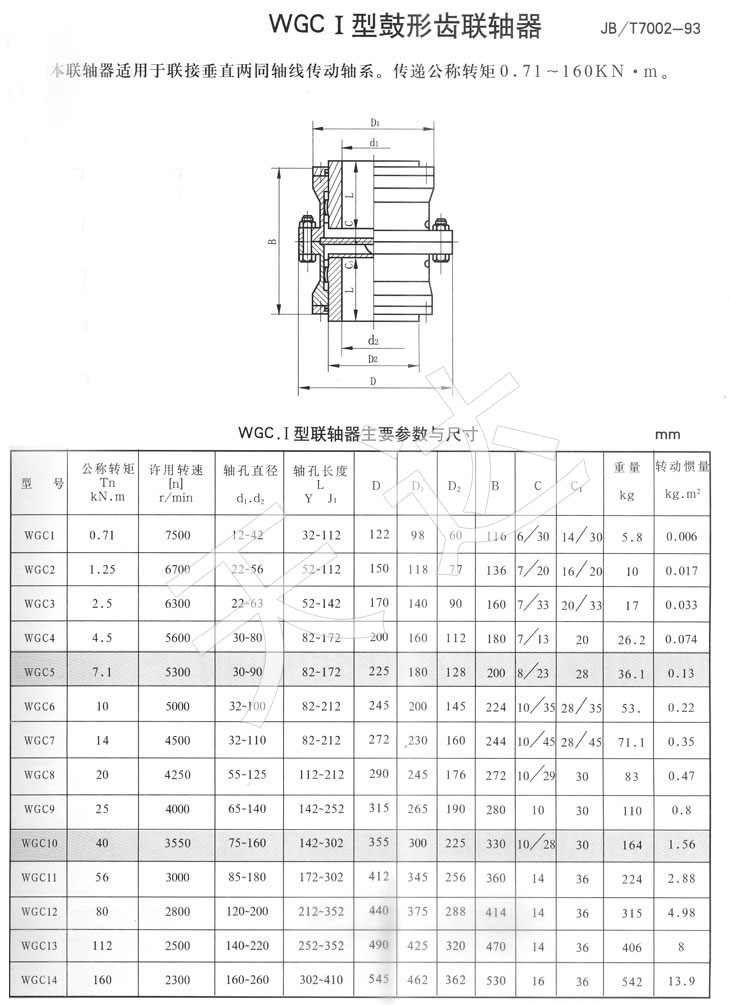 齿式联轴器径向尺寸小,承载能力大,长用于低速重载工况条件的轴系传动,并经动平衡的齿式联轴器可用于高速传动,如染汽轮机的轴系传动。由于鼓形齿式联轴器的角向补偿大于直齿式联轴器,均广泛采用鼓形齿式联轴器,直齿式联轴器属于被淘汰的产品,选用者应尽量不选用。