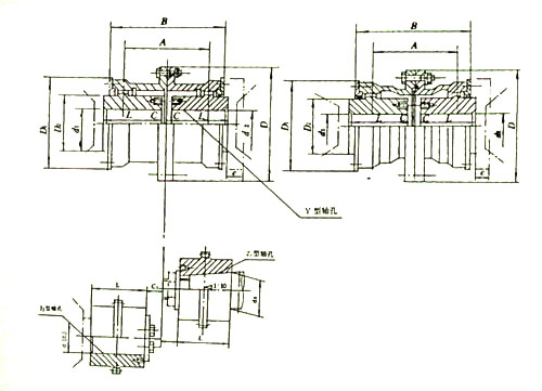 | 型号 | 公称扭矩Tn(N.m) | 许用转速[n](r/min) | 轴孔直径d1,d2,dz | 轴孔长度 | D | C | C1 | C2 | 转动惯量 Kg.m2 |