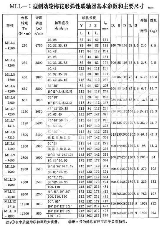 MLL-I型分体式制动轮梅花形弹性联轴器基本性能参数和主要尺寸