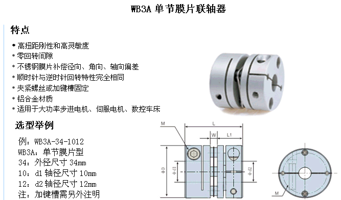 单节膜片联轴器由几组膜片(不锈钢薄板)用螺栓交错地与两半联轴器联接,每组膜片由数片叠集而成,膜片分为连杆式和不同形状的整片式。膜片联轴器靠膜片的弹性变形来补偿所联两轴的相对位移,是一种的金属强元件挠性联轴器,不用润油,结构较紧凑,,使用寿命长,无旋转间隙,不受温度和油污影响,具有耐酸、耐碱 的特点,适用于高温、高速、有腐蚀介质工况环境的轴系传动