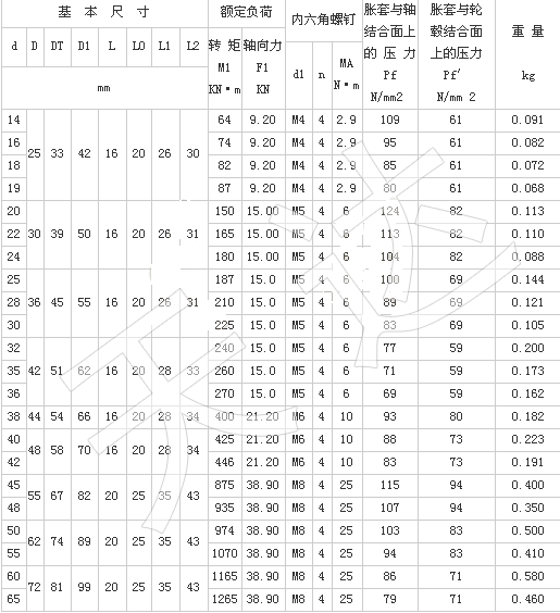 Z14型工业胀紧套标记示例:内径d=130mm、外径D=180mm的Z2型胀紧联接套:胀套Z2-130×180。使用胀套使主机零件制造和安装简单。安装胀套的轴和孔的加工不像过盈配合那样要求的制造公差。胀套安装时无须加热,冷却或加压设备,只需将螺栓按要求的力矩拧紧即可。且调整方便,可以将轮毂在轴上方便地调整到所需位置。胀套也可用来联结焊接性差的零件。
