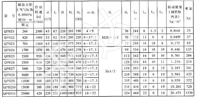 QPBZ型气动盘式制动器基本参数性能和主要尺寸