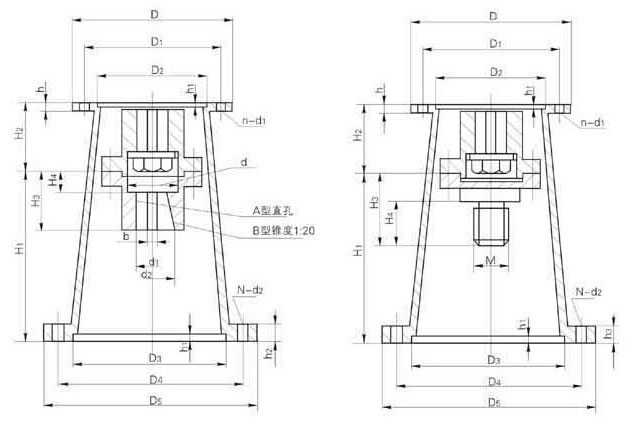 JAI大法兰机架<69标>、JAII<69标> 机架适用于摆线针轮减速机的联接,配刚性联轴器,上联轴器装JA型直孔,下联轴器装A型直孔或B型锥孔,锥度为1:20的联轴器。该机架无支承适用于反应器传来的轴向力不大时使用。