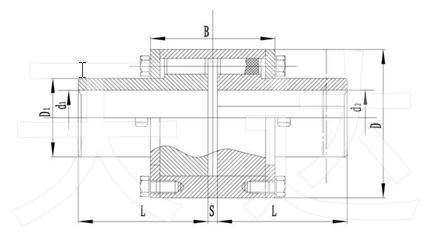 | 型号 | 公称扭矩 N.m | 许用 转速 rpm | 孔径直径mm d1、d2 | 轴孔长度mm | D | S | B | 许用补偿量 | 转动 惯量 N.m2 | 质量kg |