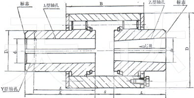 | 型号 | 公称扭矩Tn(N.m) | 许用转速[n]r/min | 轴孔直径d1 d2 | 轴孔配合长度 | D | B | S | 转动惯量Kg.m2 | 质量m Kg | |