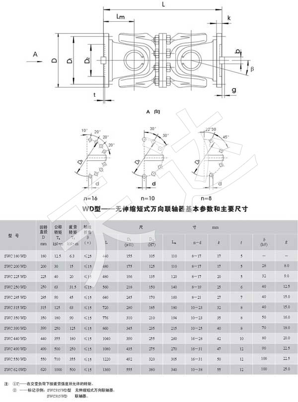 SWC-WD型无伸缩短式万向联轴器:SWC型、SWP型十字轴式万向联轴器是一种 常用的联轴器.利用其结构的特点能使不在同一轴线或轴线折角较大或轴向移动较大的两轴等角速连续回转,并地传递转矩和运动.能广泛应用于冶金、起重、工程运输、矿山、石油、船舶、煤炭、橡胶、造纸机械及其它重机行业的机械轴系中传递转矩.SWC型、SWP型十字万向联轴器的主要特点为:1.具有较大的角度补偿能力.2.结构紧凑合理.SWC型采用整体式叉头,使运载 具性.3.承载能力大.与回转直径相同的其它型式的联轴相比较,其所传递的扭矩 大,此对回转直径受限制的机械设备,其配套范围 具优越性.4.传动.其传动效率达98-99.8%,用于大功率传动,节能.5.运载平稳,噪声低,装拆维护方便.
