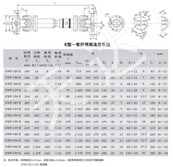 SWP_E型有伸缩法兰长型万向联轴器用来把两轴联接在一起,机器运转时两轴不能分离,只器停车并将联接拆开后,两轴才能分离。