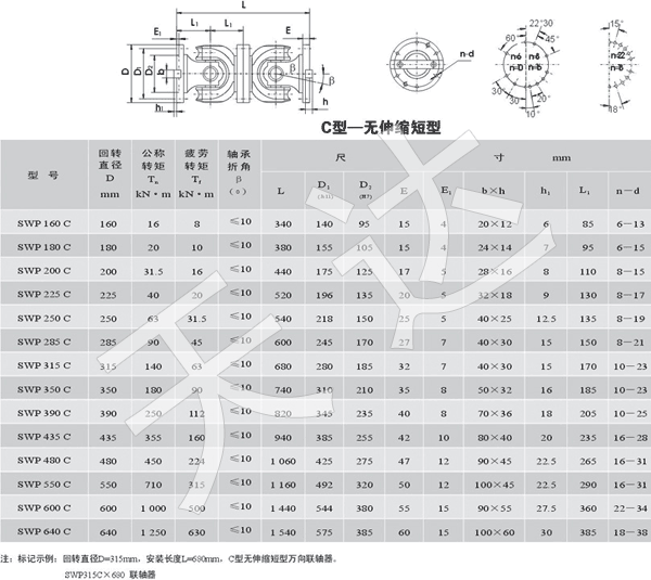 SWC型、SWP型十字轴式万向联轴器的主要特点为:1.具有较大的角度补偿能力。2.结构紧凑合理。SWC型采用整体式叉头,使运载 具性。3.承载能力大。与回转直径相同的其它型式的联轴相比较,其所传递的扭矩 大,此对回转直径受限制的机械设备,其配套范围 具优越性。4.传动。其传动效率达98-99.8%,用于大功率传动,节能。5.运载平稳,噪声低,装拆维护方便。