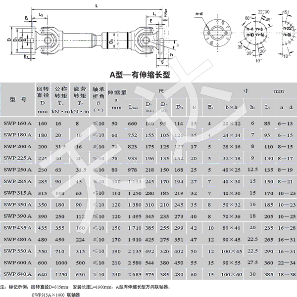 SWP_A型有伸缩单型万向联轴器,与其它结构型式的万向联轴器相比,具有传递扭矩大,使用寿命长,应用范围广等特点。它的应用特别是对冶金行业的技术改造及机械产品 新换代提供了在有利条件。