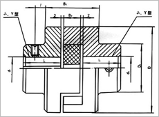 | 型号 | 公称转矩Tn(N.m) | 许用转速[n]r/min | 轴孔直径 | 轴孔长度 | D | D1 | B1 | B2 | l | 转动惯量Kg.m2 | 质量kg | |